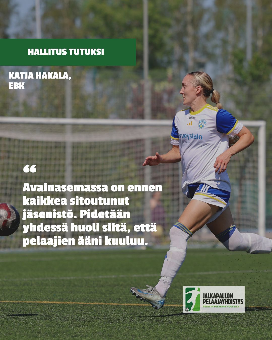 Olen Katja Hakala ja pelaan tällä hetkellä EBK:n riveissä Kansallista Ykköstä. Hurahdin jalkapalloon noin 20 vuotta sitten Luxembourgissa, missä asuimme perheeni kanssa lapsuuteni ajan. Jalkapallourani aikana olen edustanut Suomessa liigatasolla FC Honkaa, TPS:ää sekä PK-35:tä. Olen myös pelannut Englannissa Oxford Unitedin joukkueessa WSL 2:sta. Pelaamisen lisäksi olen useamman vuoden ajan työskennellyt pankkialalla sijoittamisen parissa.